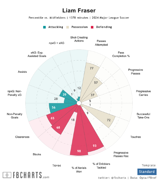 Fraser saw his season end early in the summer after appearing in 18 games (17 of those as a starter). He had one goal and one assist. As you’ll see below, he is a fairly steady player both as a passer and as a defender. He’s not one to really facilitate the attack but at times he does get into position to score (like his goal you’ll see below).