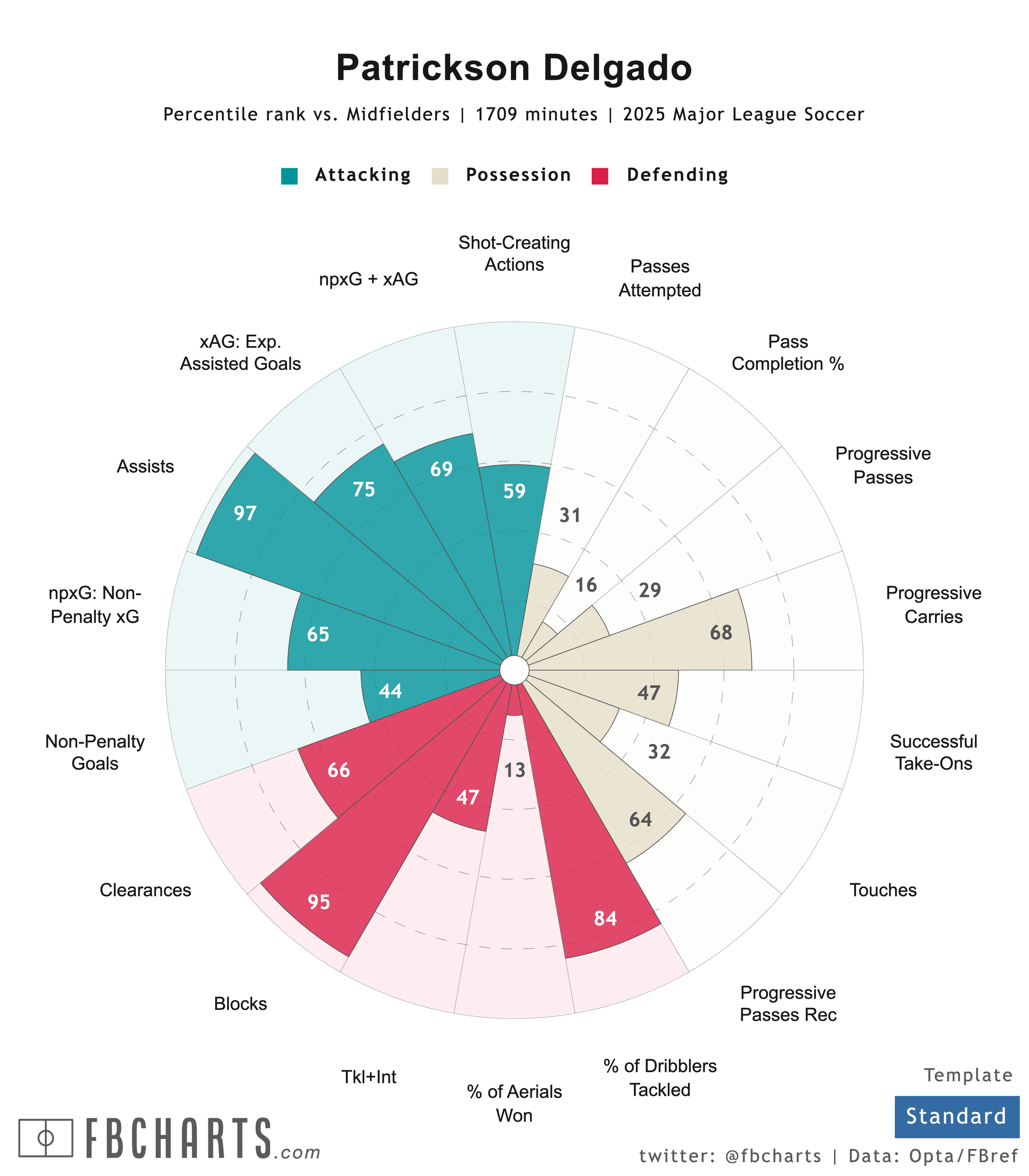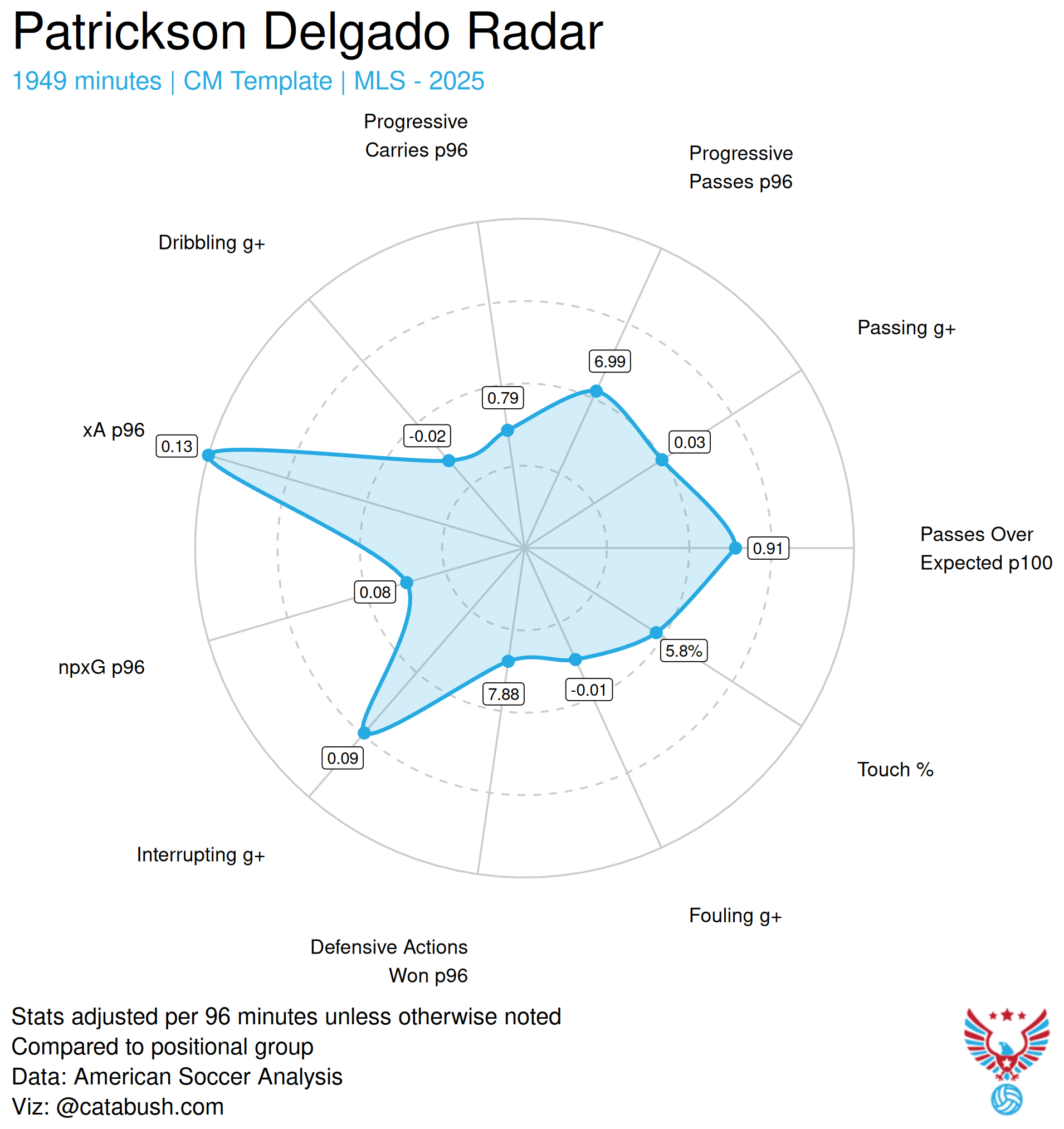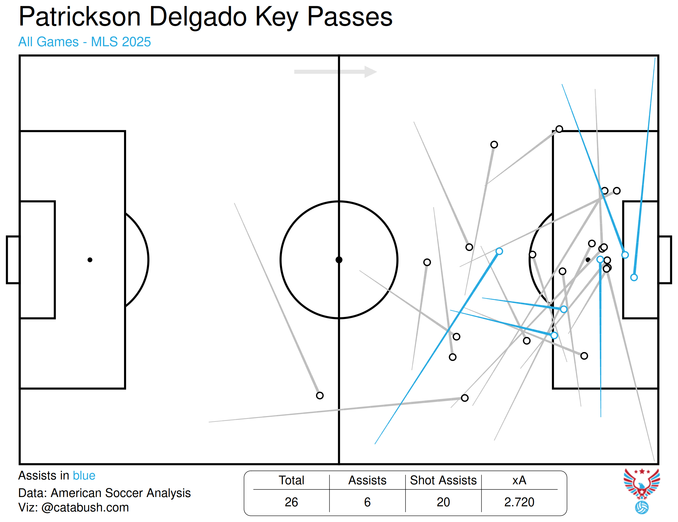 Delgado is an intriguing player for me. He’s not a stat-machine, at least not yet, in his career. But he does bring a lot of intangibles that Quill loves to have on the field. He’s feisty, but not too aggressive in a way that leads to a lot of yellow cards (he only had three of those in 2025). He does well at getting on the ball and finding teammates in good spots (having a Petar Musa doesn’t hurt in that regard).