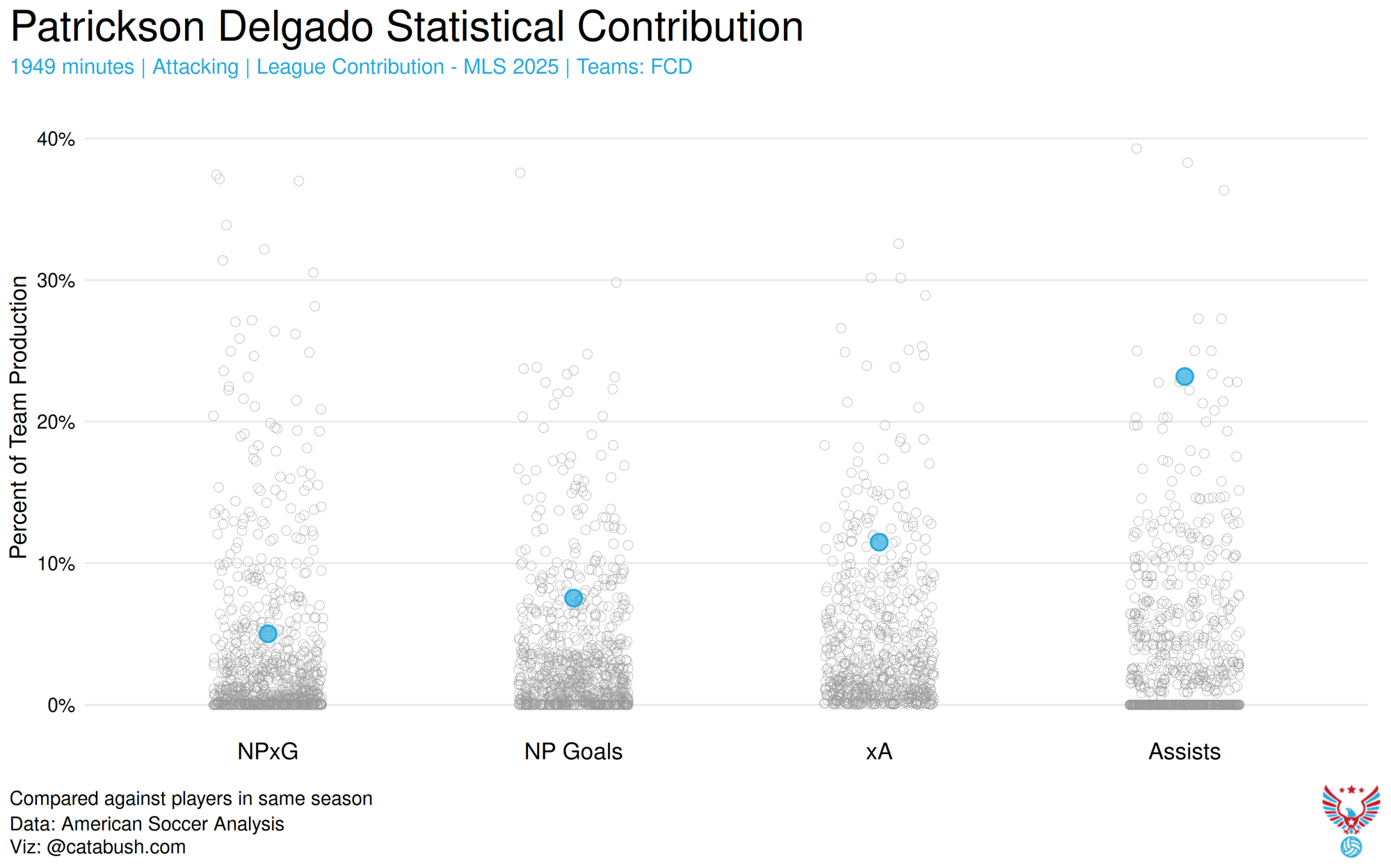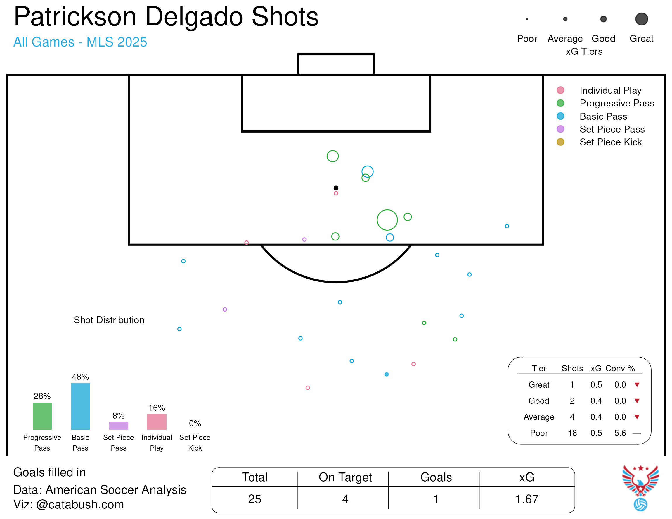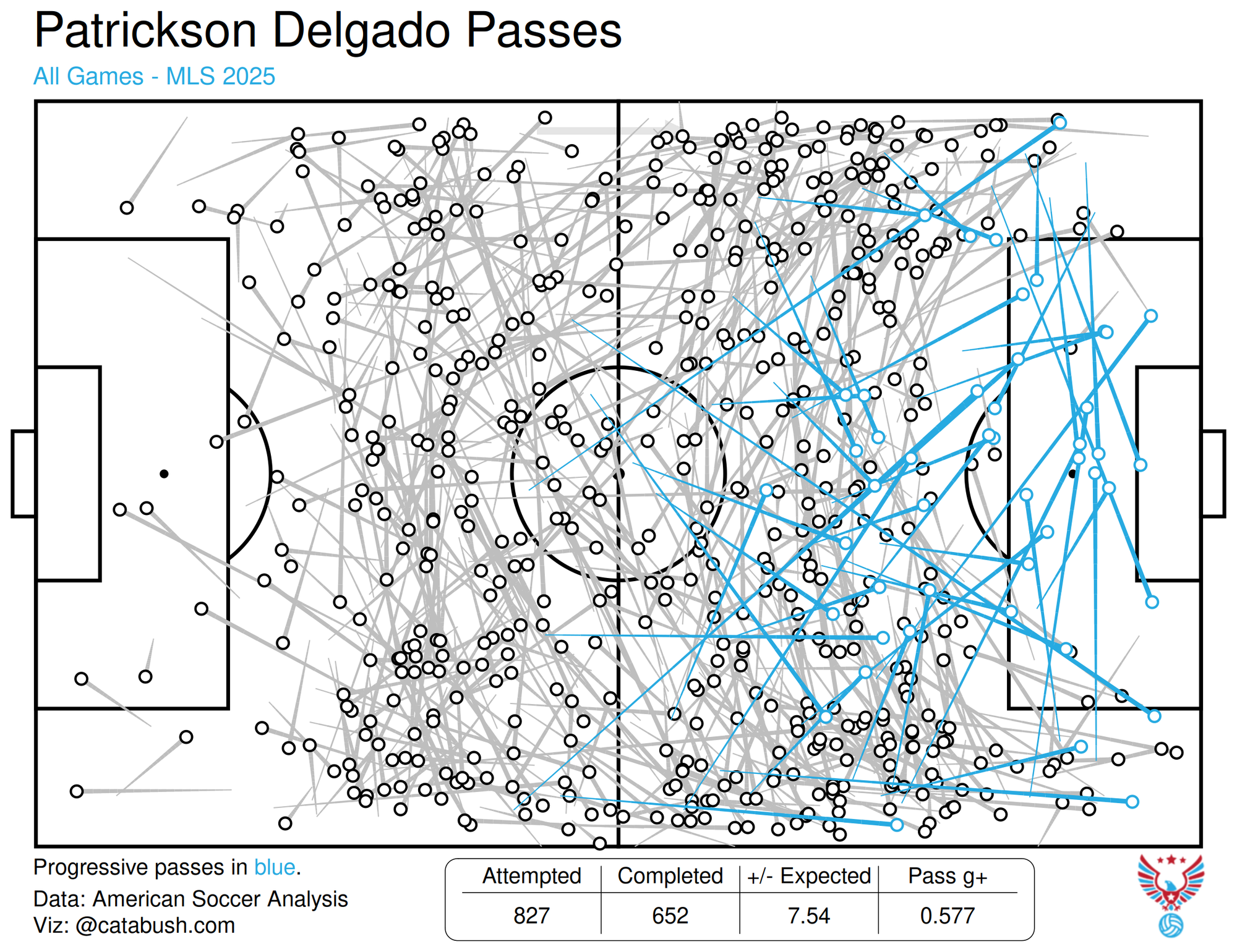 Delgado is an intriguing player for me. He’s not a stat-machine, at least not yet, in his career. But he does bring a lot of intangibles that Quill loves to have on the field. He’s feisty, but not too aggressive in a way that leads to a lot of yellow cards (he only had three of those in 2025). He does well at getting on the ball and finding teammates in good spots (having a Petar Musa doesn’t hurt in that regard).