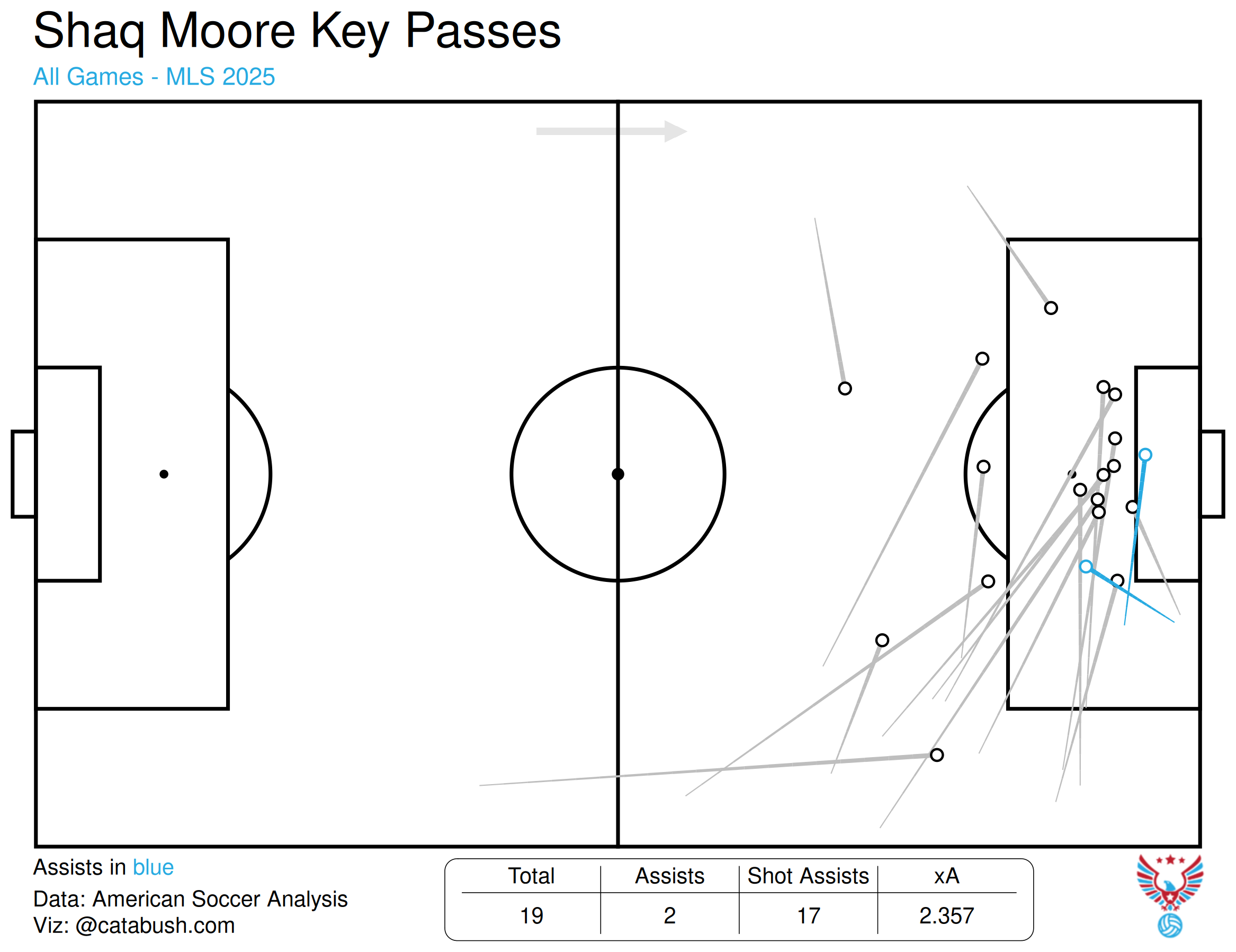 It was a career-year for Moore in terms of goals scored with three. His one against Austin was my favorite.