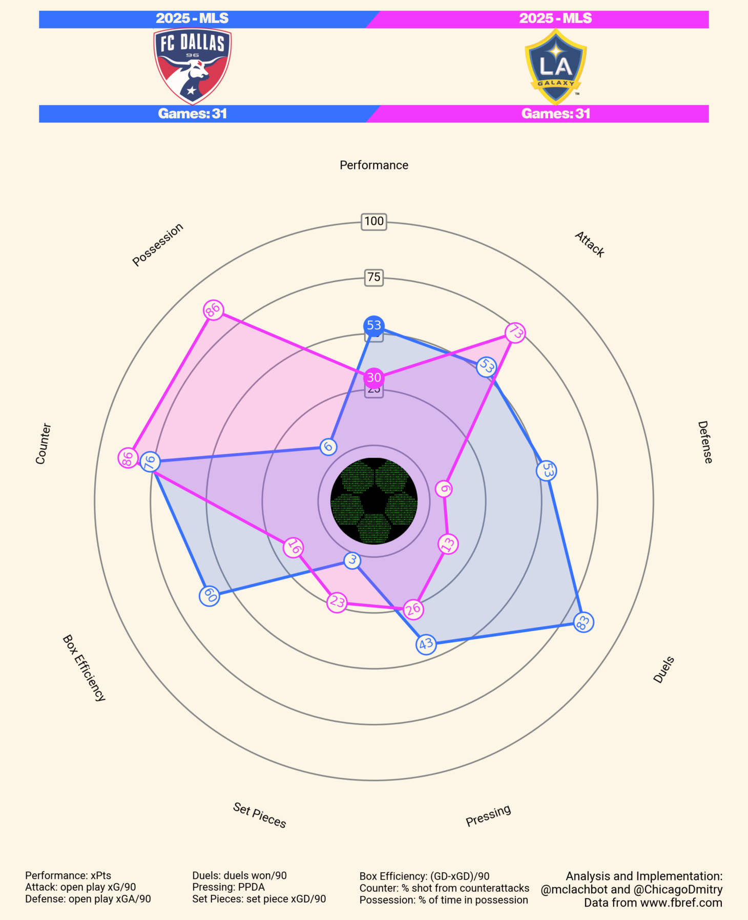 Comparing the two clubs: The Galaxy are going to want to possess the ball as much as possible, but what they do with it in the end hasn’t been great in 2025.