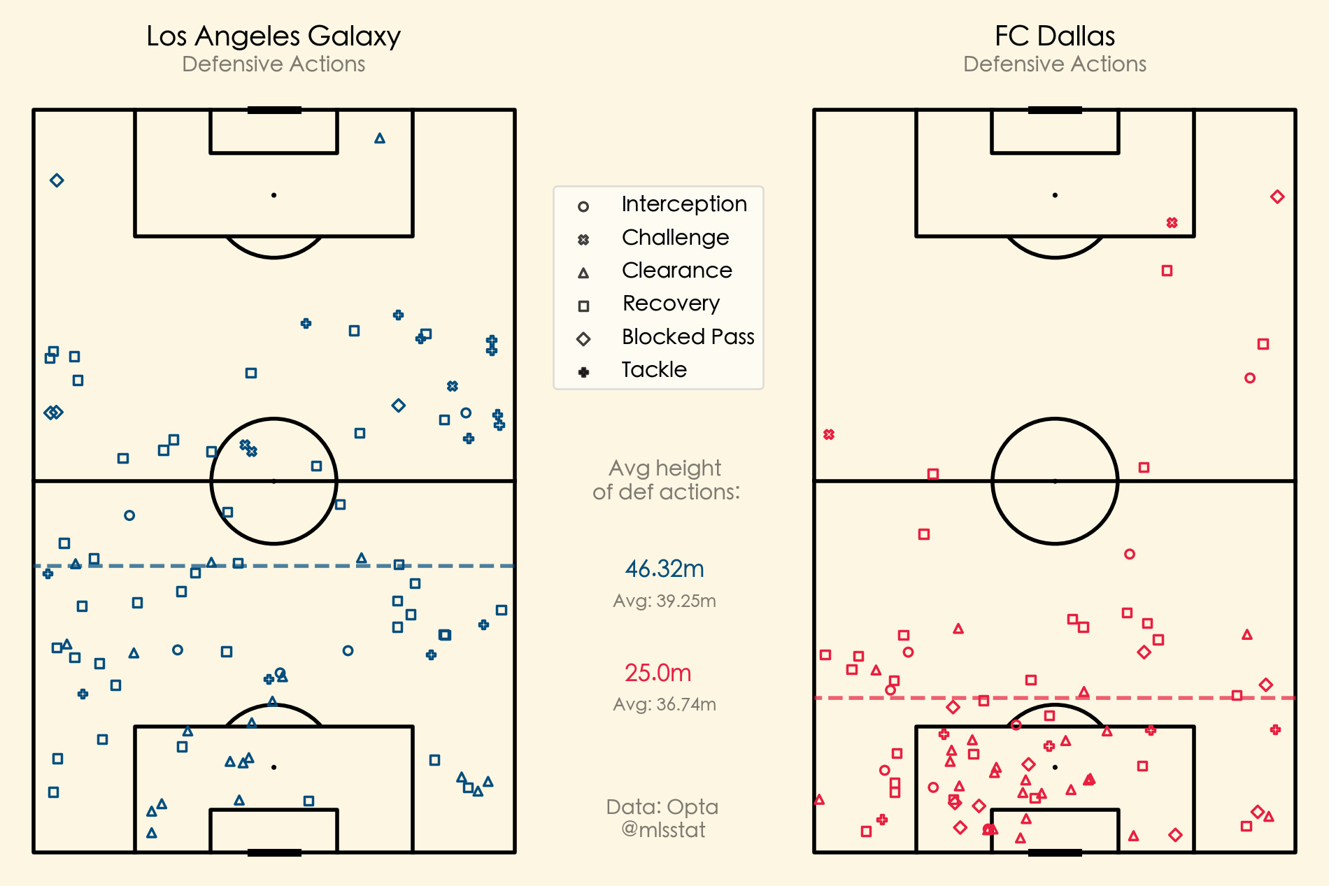 The average defensive height of the defensive actions for FC Dallas between the first LA game and the second is pretty massive, almost a 20-meter difference. By being up a man for nearly 85 minutes, the Galaxy were able to push their agenda more in this game.