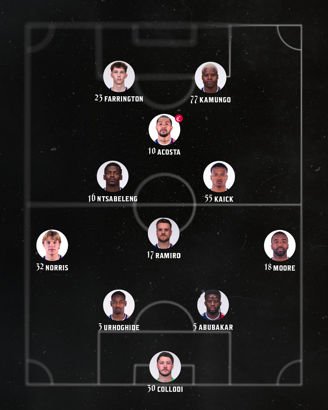 Defensively, Michael Collodi makes his second start in goal. In front of him, Nolan Norris and Shaq Moore are on the wings with Lalas Abubakar and Osaze Urhoghide in the middle.