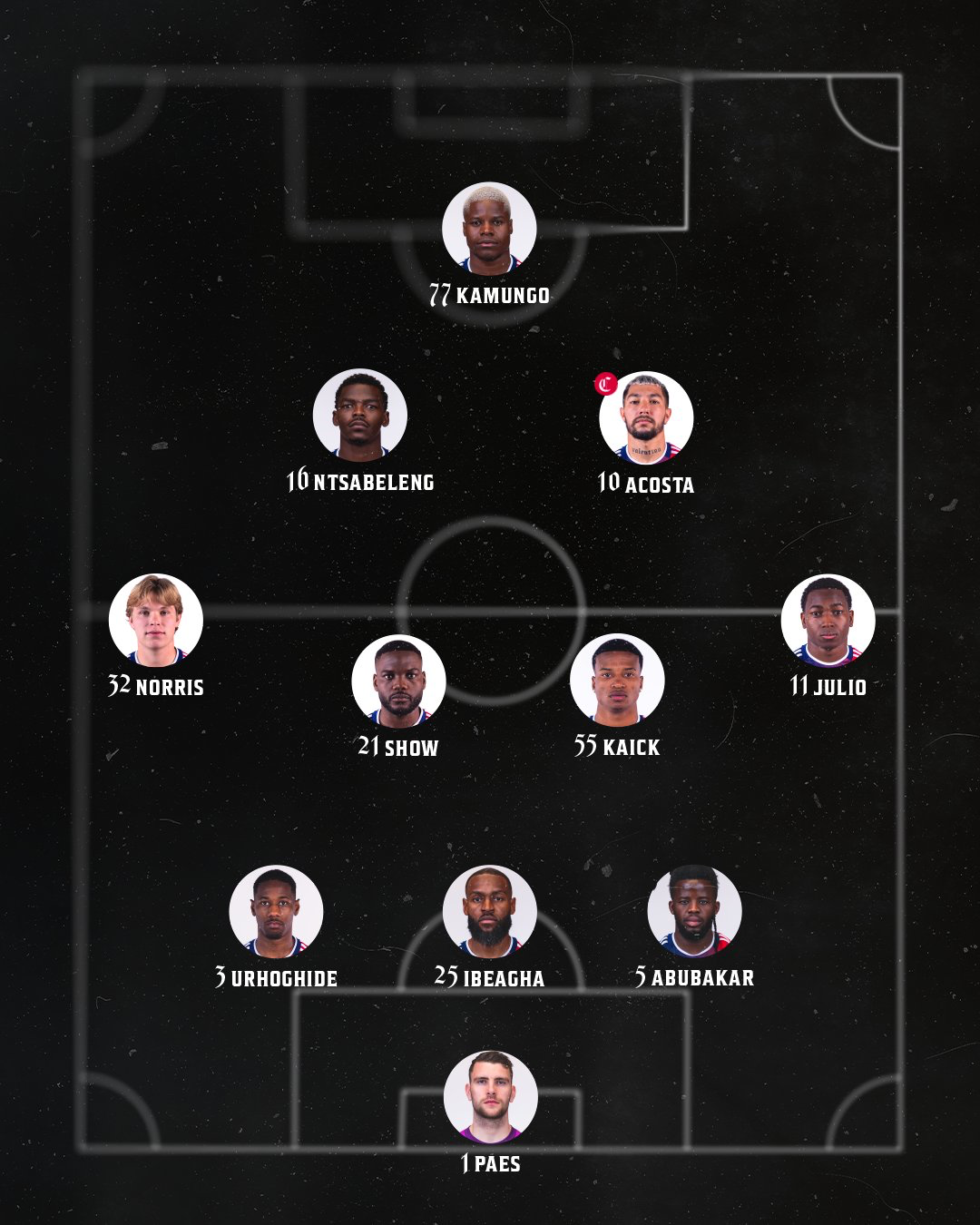The midfield in front of them sees Nolan Norris and Anderson Julio on the wings, with Show and Kaick. Show is in the match for Ramiro, who is suspended tonight for yellow card accumulation.