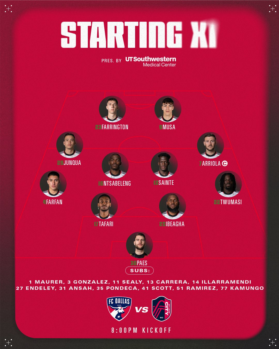 Up top, Petar Musa returns to the lineup, fresh off his MLS All-Star Game appearance on Wednesday night. He’ll have Paul Arriola and Logan Farrington in support.