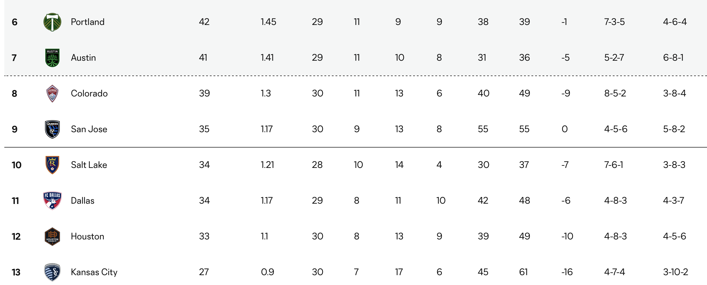 Notes: I've said for the last couple of weeks that I thought the Rapids were cooked and then they go out and get a stoppage-time own goal from the Dynamo to pick up three points. I mean, come on. What a gift. Their schedule is still pretty tricky from here on out, so draws don't really help move the needle away from the Wild Card spot.