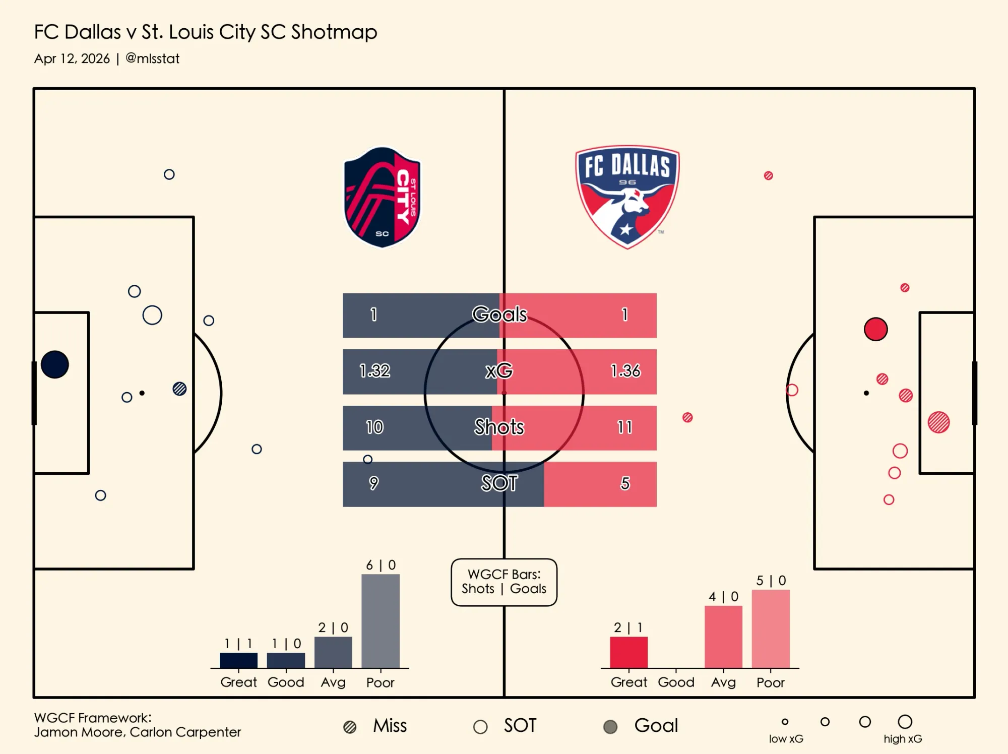 In pure xG talk, this game was a coin flip. Dallas barely outdid St. Louis 1.44 to 1.28.